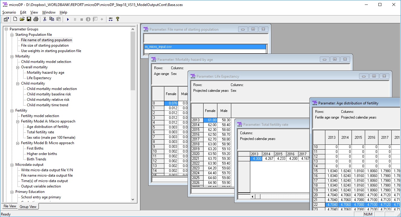 - Micro-data files to be further analyzed using statistical software (depending on the model). The population projection model for examples can produce periodic files (the user sets the first time point of file output and the time interval for repeated output) of a list of variables, which the user selects. Output is written into CSV text files, which have a header row with variable names.