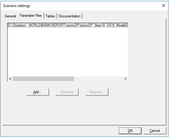 - Parameter Files tab: can see, change, or add parameter files belonging to the scenario. When saving an existing scenario under a new name, all parameter files of the model will automatically be copied with a file name consisting of the scenario name and data file name. Usually no user operations are required.