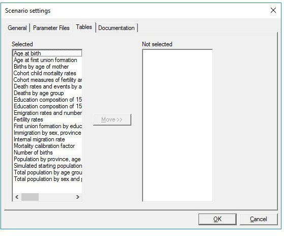 - Tables Tab: displays the list of available output tables. Tables can be de-selected if not needed.