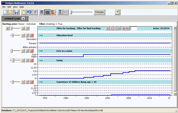 - A sample of individual life-course data, which can be displayed graphically using the BioBrowser application. This feature is not used in the population projection model, but is very useful, especially for debugging, as it can filter “strange” cases and study simulated lives in full detail.