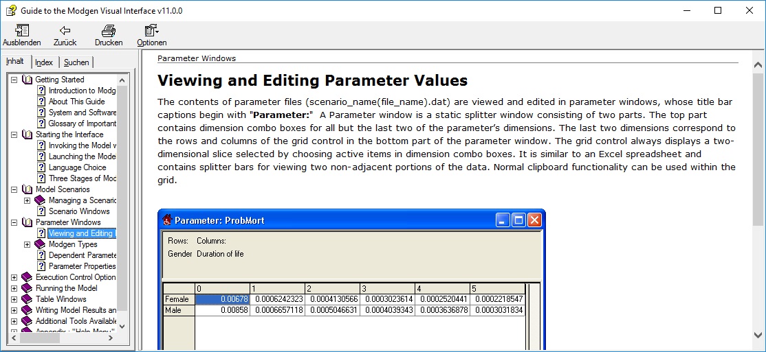 This chapter expands on the short presentation of the user interface in Chapter 1, section 1.4. Modgen models are Windows applications running on standard PCs and share the same graphical user interface, with a menu bar, short-cut icons for key commands, and a help system. The Modgen user interface is organized into two parts: a navigation area displaying a hierarchical list of all parameters, and, after running the model, all output tables. For both parameter and output tables, space is typically devoted to the display area. Parameter tables can be directly edited in the user interface. By changing parameters, users can create and save new scenarios. After running a model, all output tables become available. Table results can be exported into Excel individually or together, to an Excel Workbook.