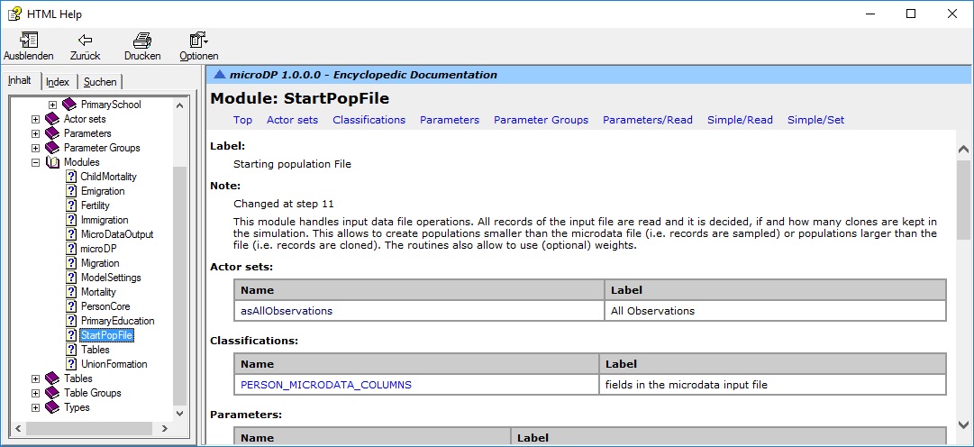 Modgen automatically produces a hyperlinked help file containing model documentation based on the model code as well as labels and notes within the code. Variable labels and other information within the code are also used for producing a fully labeled user interface, including labeled output tables (e.g., table name, variable names, and description of variable dimensions).