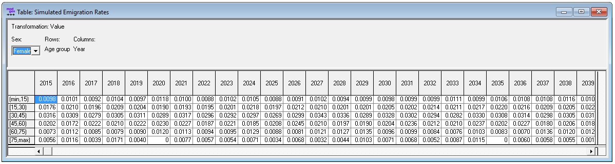 For example, the following table calculates the simulated emigration hazards by age group, sex, and calendar year. For sufficiently large simulated populations, the simulated rates should come close to the parameter.